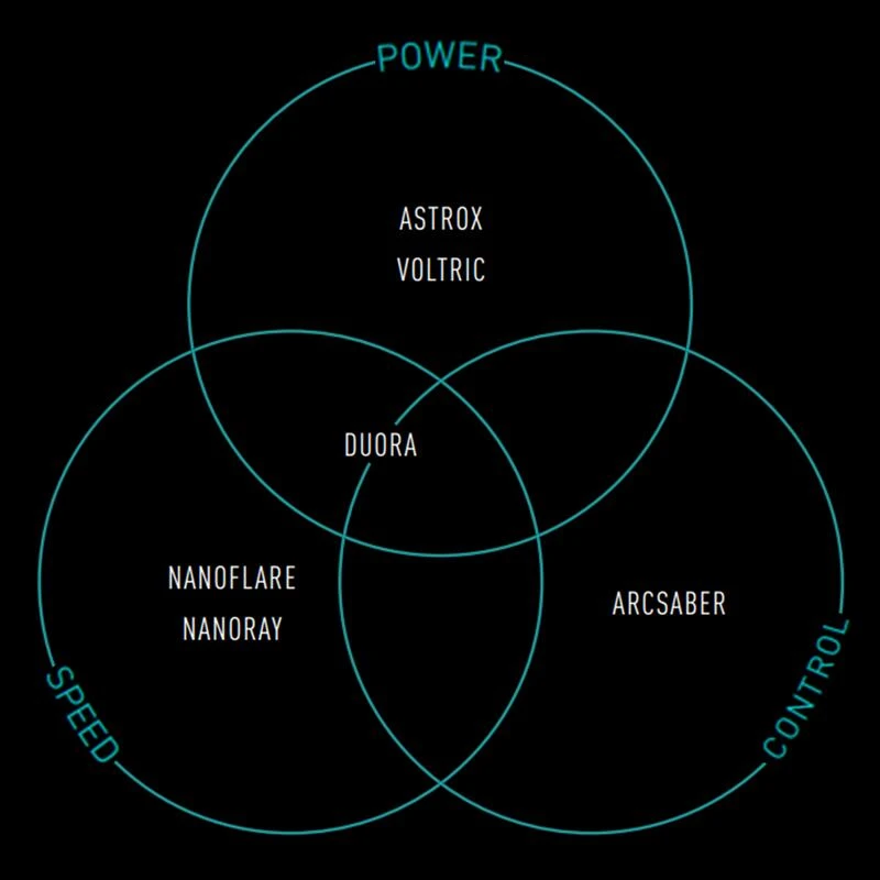 Raquette axée puissance avec ASTROX (remplaçante de la gamme VOLTRIC) pour répondre aux exigences d’un jeu offensif et agressif. Elles ont un équilibre plus ou moins en tête pour accentuer vos attaques avec des smashs piqués.